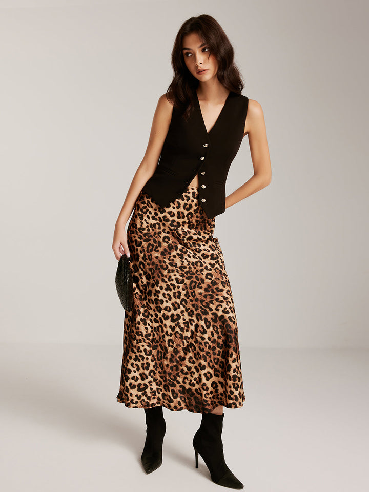 Metal-Button Vest With Leopard Zipper Skirt Set