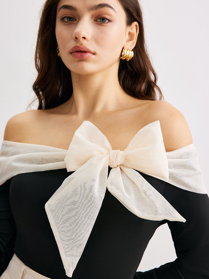 Chiffon-Bow Off-Shoulder Slim Blouse