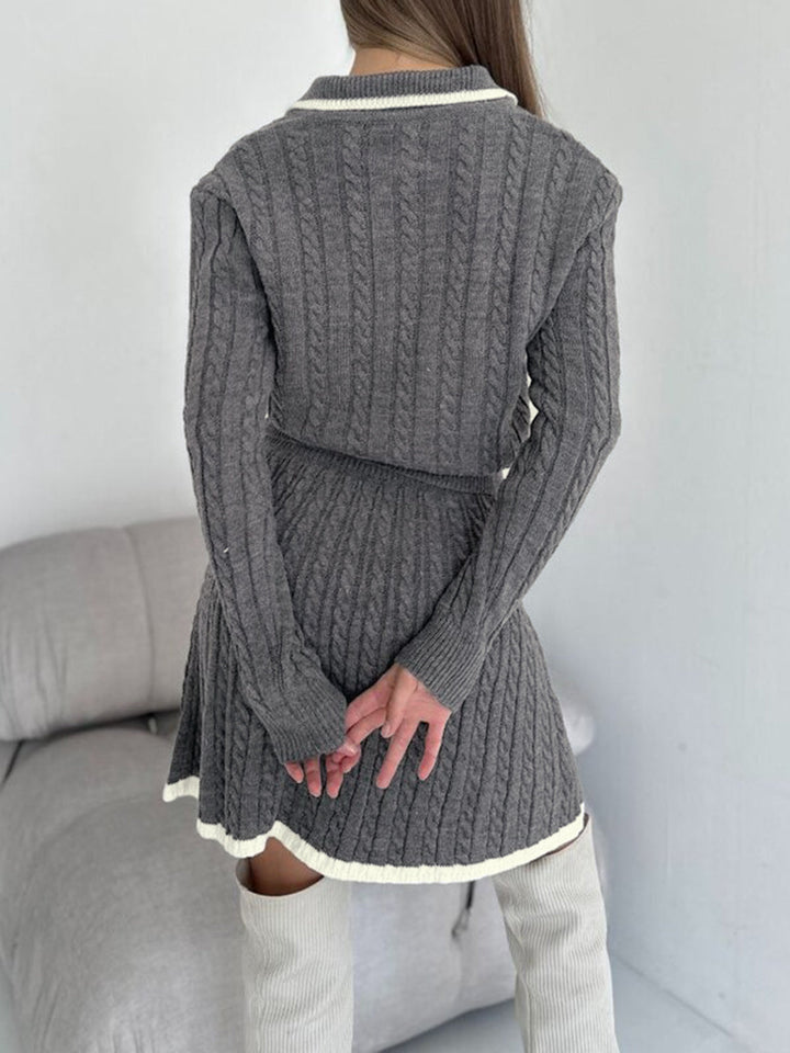 Contrast Trim Cable-Knit Lapel Skirt Set