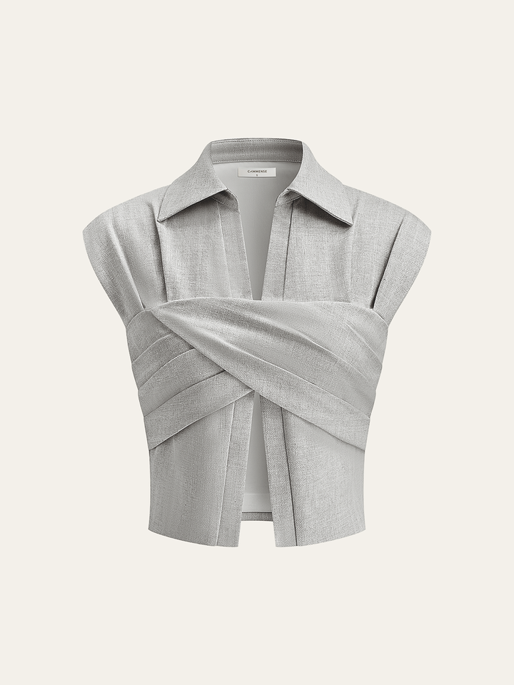 Linen Blend Cropped Blouse with Cross Wrap Detail