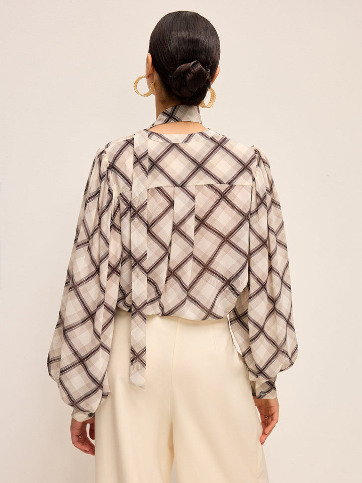 Long-Sleeve Plaid Chiffon Shirt With Neck-Tie Detail