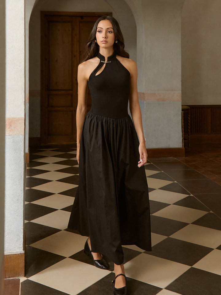 Asymmetric Pockets Cold Shoulder Pleated Long Dress