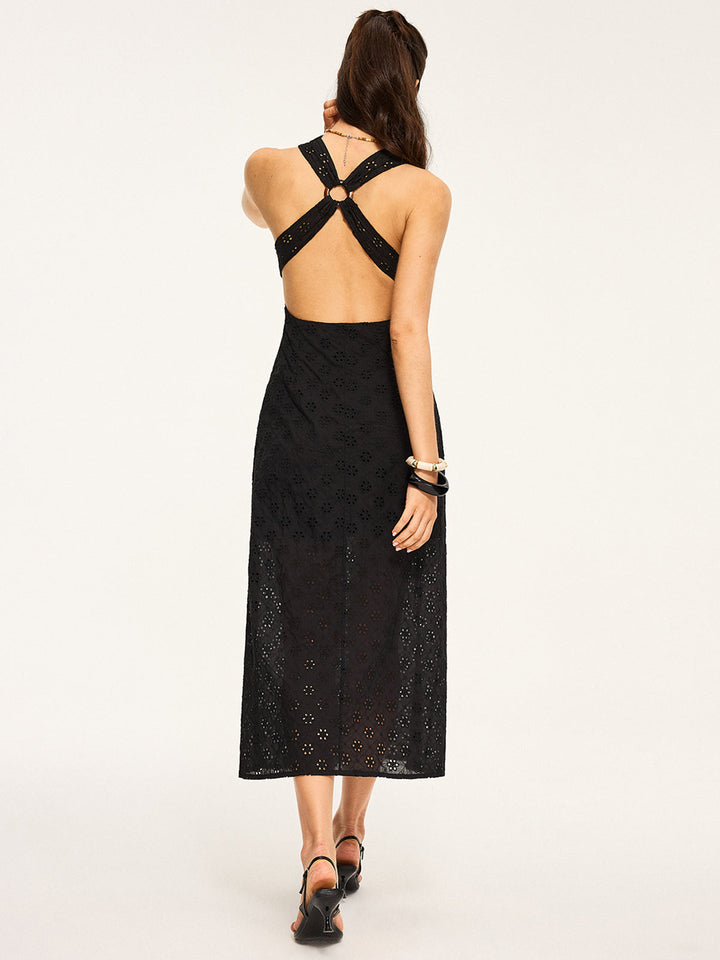 Semi-Sheer Eyelet Backless Criss-Cross Midi Dress